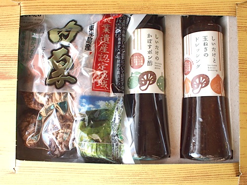 じゃーん!しいたけドレッシングセットです。干ししいたけは水で戻すと、すごーく肉厚でした。いいお味がでます。ドレッシングは、面白いですねえ~本当にしいたけの風味がします。しいたけのかぼずポン酢は、なんでもこの株主優待品の為に製造された!?とか。
