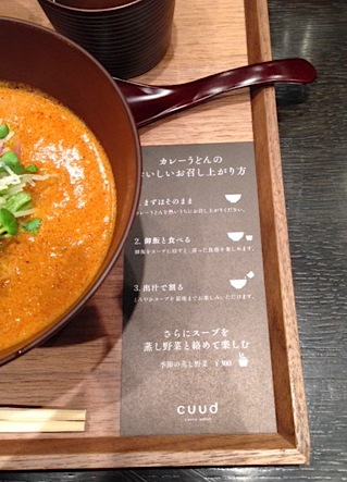 cuud Posted on 2016年5月23日 by sense 羽田空港で、お洒落なカレーうどん屋さん「cuud」を発見 おしぼりから、グラスまでお洒落♪ こちらのカレーうどんは、和風出汁ベース。 自家製ピクルス付きでとっても美味しかったです。 食べ方があるらしい。まずは①そのまま→②ご飯とたべる→③出汁で割る 3通りの食べ方が出来ます。 麺は出汁とからみやすく、細麺でしたよん♪